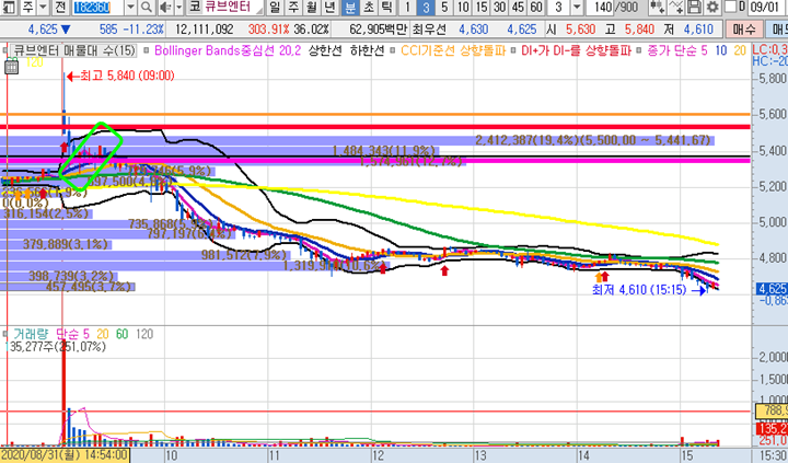 큐브엔터 3분봉 입니다. 최초 5300원 매수를 시작으로 5400원 절반매도 이후 마음편히 피봇2차저항대인 5530원까지 홀딩하려고 시도한 종목이지만 그 이상 갈 힘이 부족해보여 나머지물량도 5400원에 전량매도한 종목입니다. 2%의 수익이 실현된 종목이지만 그 이후에 접근했다면 보시는 차트처럼 시초가가 가장 높은가격이면서 종가가 가장 최저가인 최악의 못난이 종목이였음을 알 수 있습니다.