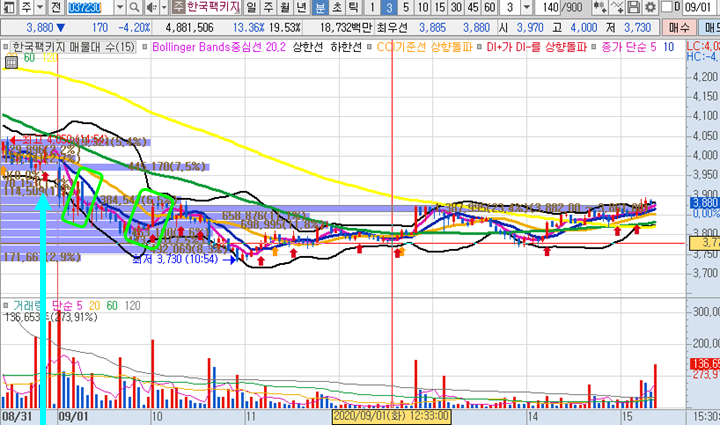 한국팩키지 3분봉 입니다. 어제 종가배팅으로 들어간 종목으로 갭상승을 기대하였지만 첫번째 캔들부터 음봉으로 빠지기시작하여 볼린저밴드 하단지지를 보고 3880원에 2배수 추매를 언급하였습니다. 그 이후 곧 바로 3935원까지 상승하며 1.42% 수익구간이있었지만, 물량이 전부다 매도되지않아 일단홀딩하기로 하며 버텼는데 주가가 계속적으로 하락하며 불안하게 했습니다. 결국 본전 바로 아래부근까지 상승했을 때에 오전 매매시간이 종료되는 시점인 10시경 에서 물량을 모두 털어내며 한국팩키지와의 긴 여정을 끝냈습니다.