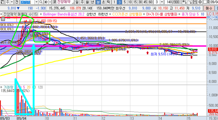 진양제약 3분봉 입니다. 어제도 보고 있었던 종목으로 결국 상한가로 마감되었습니다. 오늘 또한 시초가부터 갭상승이 뜨면서 시초가 돌파로 접근했다면 큰수익을 쉽게 실현할 수 있었습니다. 그러나 10시가 다되갈 무렵 두번째 네모박스 구간에서 지지하고 오르는 걸로 생각하고 들어갔다가 한호가 아래에서 정리하고 나온 종목입니다.