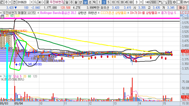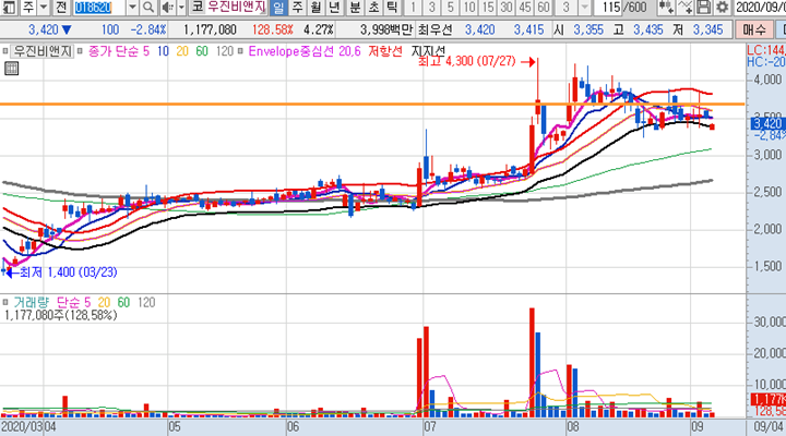 우진비앤지 일봉차트 입니다. 시초가 급락 출발로 엔벨로프 최하단에 캔들이 위치한 상태로 양봉 마감되었습니다. 지금부터 시작하여 다시 몇일동안 올라와야 하는 종목입니다.
