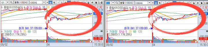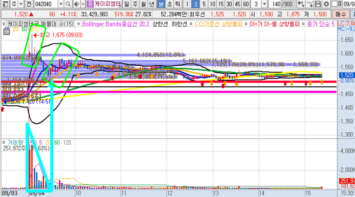 케이피엠테크 3분봉 입니다. 장 시작전 예상종목으로 선정하였으며 시초가 갭상승이 나왔으며 2번째 캔들에서 시초가 최고점을 강하게 뚫어주면서 순간적으로 4%의 급등 구간이 나왔으며 곧바로 주가가 하락하며 황금선까지 내려왔지만 정확히 황금선 구간에서 다시 반등이 나오면서 다시 4.6%의 수익구간이 나왔습니다.