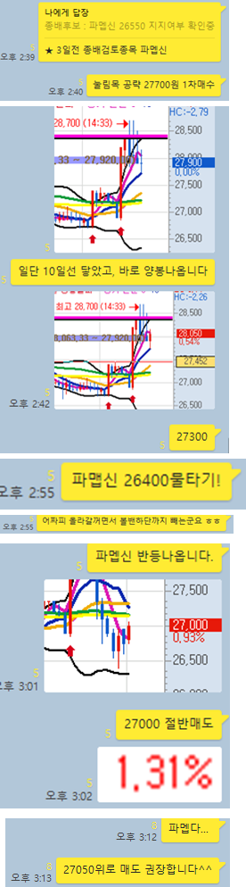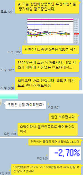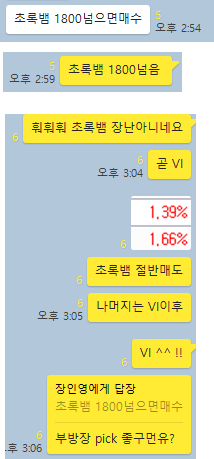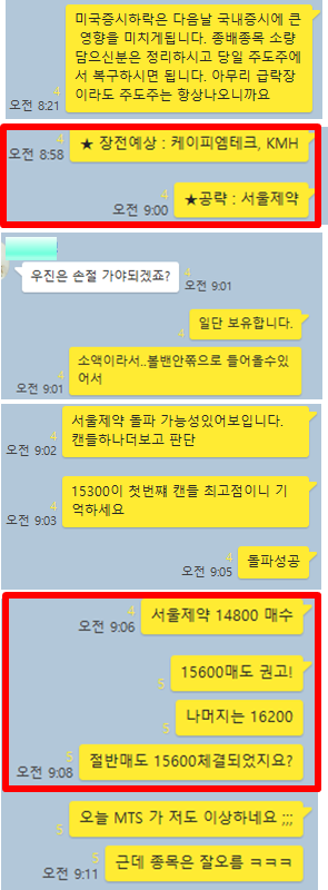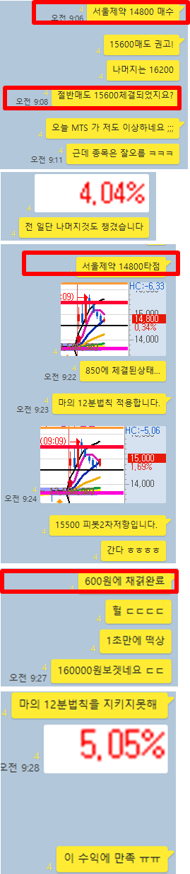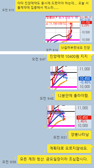 오늘 장전예상 종목 2개와, 공략종목 1개를 선정하였습니다. 단 하나의 공략종목을 알차게 공략하게 5%대 수익률을 2번 실현 할 수 있었습니다. 그럼 전체적인 매매타점에 대해 카카오톡 대화내용과 차트를 보면서 자세히 설명 드리겠습니다.