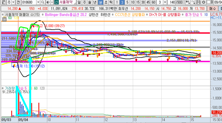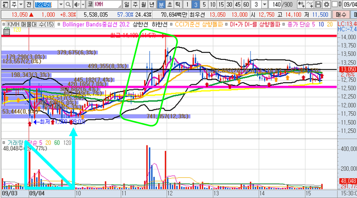 KMH 3분봉 입니다. 장 시작전 예상종목으로 선정하였으며 시초가 갭상승 직후 바로 볼린저밴드 하단까지 찍은다음에 서서히 주가가 올라온 종목으로 12시에는 피봇2차저항 최고점 14100원까지 찍으면서 장중 17%이상의 급등이 나왔던 종목입니다.