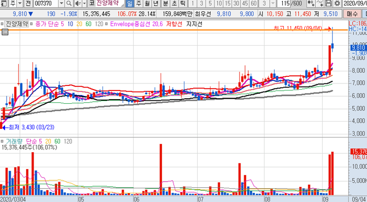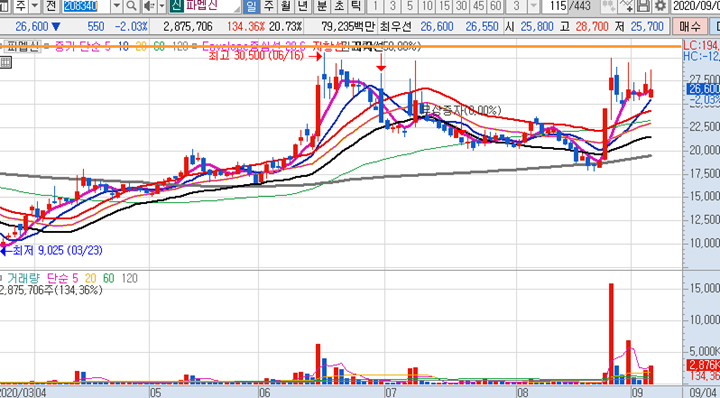 파멥신 일봉차트 입니다. 일봉상 10일선을 견고하게 지키면서 매일마다 양봉이 나오고 있는 종목입니다. 다음주에 위로 시세가 한번 크게 나오면서 신고가를 갱신 해주기를 기대하고 있습니다.
