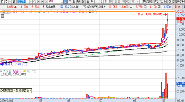 KMH 일봉차트 입니다. 어제의 급등시세 이후에도 오늘 추가적인 급등이나오며 역대급 신고가를 돌파한 종목입니다. 아무래도 저점대비 3배 이상 오른때라 수급은 모두 순매도로 돌아서있습니다.
