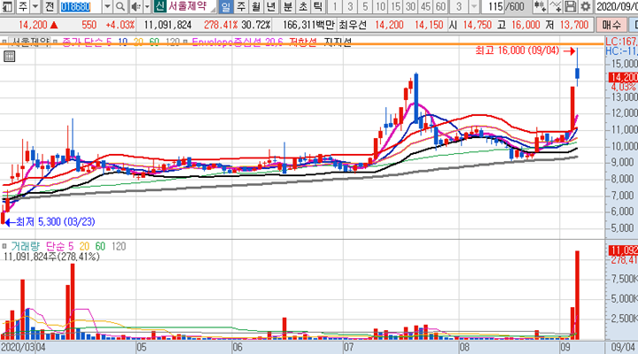 서울제약 일봉차트 입니다. 전일급등이후 오늘도 큰 급등이 나오면서 시초가에는 역대급 신고가 가격을 갱신하였지만 오후장에 밀리면서 긴 윗꼬리가 달린 음봉으로 마감되었습니다.