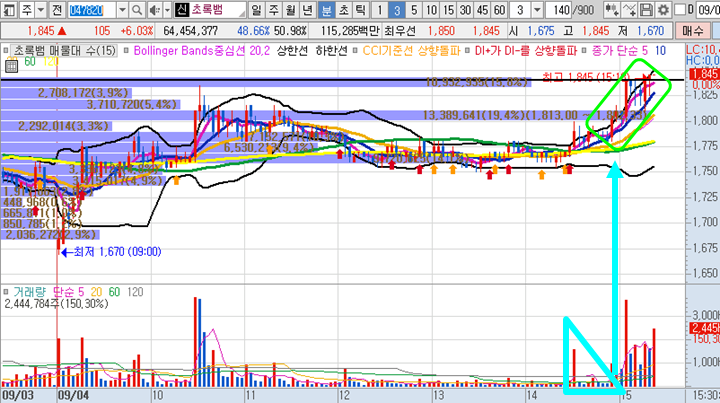 초록뱀 3분봉 입니다. 오후장에 거래량이 증가하면서 피봇1차저항까지 올라올 것이라 생각하며 1800원 돌파시 함께 매수하기로 한 종목으로 매수하고 10분이내 vi에 걸리면서 수익을 실현할 수 있었던 종목입니다.