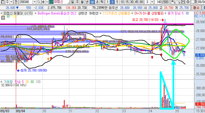 파멥신 3분봉 입니다. 오후장에 거래량이 급증하면서 크게 시세가 나온 종목으로 전일고점돌파후 눌림목 매매를 시도하였습니다. 원래 3일전 종가배팅으로 검토한 종목이였는데 하지 않고 다시 보니 주가가 한참올라와있는 상태였습니다. 그러나 매수자리에서 지지선을 깨면서 볼린저밴드 하단까지 갑자기 하락하면서 26400원에 물타기를 하면서 1프로대 수익으로 겨우 나온 상태로 남은 물량을 조금 보유중입니다.