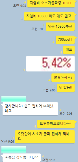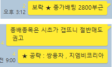 종가배팅 종목 2개를 무난하게 1~2%수익을 실현할 수 있었으며, 시초가 공략종목의 경우 오랜만에 시초가 돌파를 성공하면서 양질의 수익을 실현하며 기분좋게 시작한 하루였습니다. 특이사항으로 며칠째 연속적으로 공유하고 있는 앤디포스가 오후장에 급등이 나오며 장중 최고 28%이상 급등이 나왔었습니다. 그럼 전체적인 매매타점에 대해 카카오톡 대화내용과 차트를 보면서 자세히 설명 드리겠습니다.