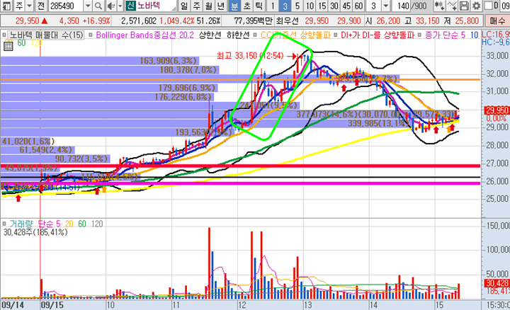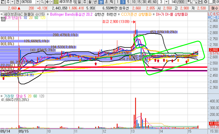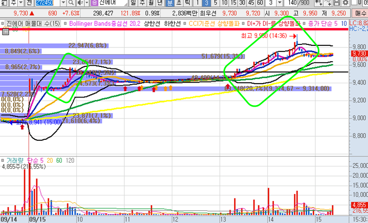 세이브존I&C 3분봉 입니다. 점심시간 이후에 거래량이 급증하며 급등현상이 있었던 이후에 눌림목을 공략하기로 결심한 종목입니다. 첫번째 알려준 타점구간에서 1% 수익을 바로 챙길 수 있었으며, 그 이후에 주가가 급락이 나오며 공포에 떨게 했지만 볼린저밴드 하단선까지만 하락하며 그 당시 추가매수를 한 이후에 주가가 장 종료될 때까지 지속적으로 오르며 현재 3.5%수익 상태로 일부물량이 종가배팅으로 보유하고 있는 중입니다. 아까 앤디포스에서 설명드린 화살표를 기억하신다면 세이브존 차트에서도 여러 개 표시된 화살표가 어떤 의미인지 감을 잡으실 겁니다. 내일 갭상승시에 매도하고 인증하도록 하겠습니다^^