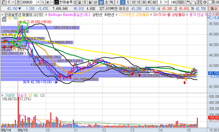 한화솔루션 3분봉 입니다. 오늘 장전예상 종목으로 갭상승이 나온 이후로 10일선 눌림목 매매시에 1.45% 수익이 3분만에 가능한 종목이였으나 그 이후에는 주가가 급락이 나오면서 매매했다면 후회했을만한 종목입니다.