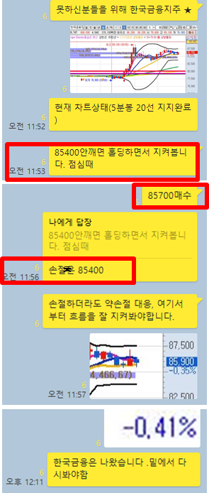 한국금융지주 3분봉 입니다. 점심특선종목으로 앞서 소개한 노바텍 이후에 언급한 종목으로 “지켜야할 자리를 지키지 못하여” 과감하게 짧은 손절(0.4%)을 한 종목입니다. 네모박스 이후 차트를 보시면 약손절을 얼마나 잘했는지 알 수 있을 겁니다. 이렇게 차트방향이 틀리다면 과감하게 손절할 수 있는 결단력이 중요합니다. 큰 손실을 입을 수 있었던 종목도 이렇게 거의 영향을 미치지 않을 정도의 약손실로 마무리 지을 수 있으니까요.