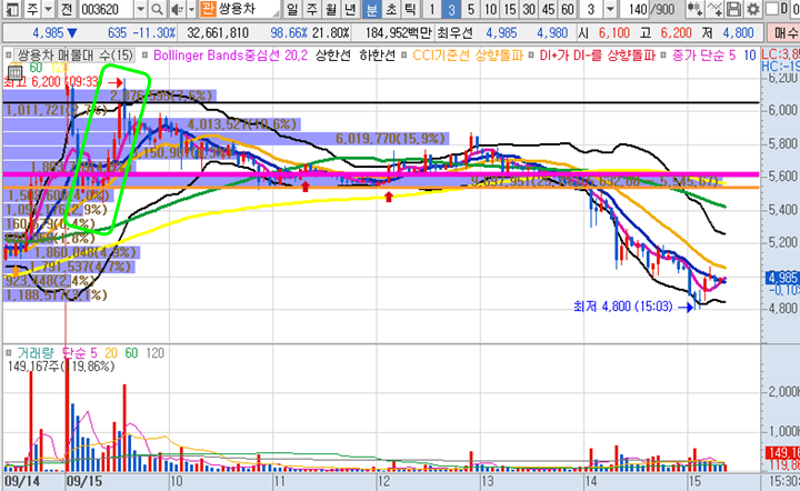 쌍용차 3분봉 입니다. 시초가 공략종목으로 첫번째 캔들 갭상승이후 음봉3개가 나왔지만 정확히 20일선을 지지하면서 정석대로 매수하는 타점까지 내려와주며 바로 급등이 나와준 종목입니다. 원칙대응한 경우 5490원(20일 황금선)에서 시초가 돌파 구간 6200원까지 15분만에 무려 13%가까운 수익을 챙길 수 있었던 오늘의 공략종목입니다.