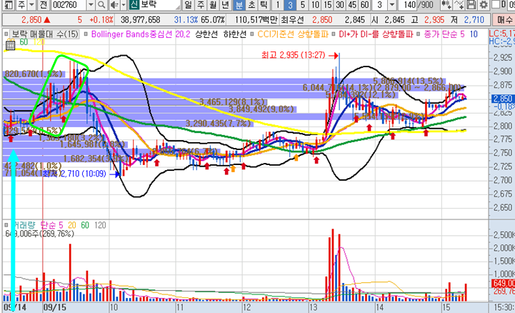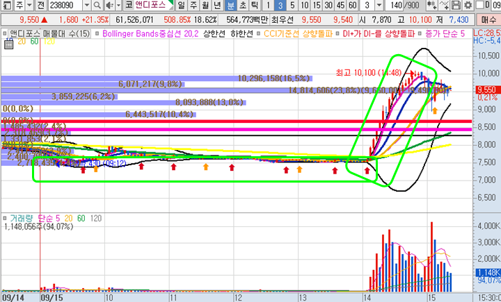 앤디포스 3분봉 입니다. 장전예상종목으로 최근 매우 활발하게 거래된 종목입니다. 그러나 오늘은 시초가에 힘이 없어 보였으며 시초가에는 이렇다할 매매타점도 보이지 않아서 패스했는데 거의 장막판에 거래량이 서서히 붙기 시작하더니 30분만에 이대로 28%이상의 급등이 나왔습니다. 최저점 대비해서는 무려 34%의 수익구간입니다. 이 차트를 보시면 제가 길게 연두색으로 표시한 네모박스안에 빨간색 주황색 화살표들이 표시되있는 것을 볼 수 있습니다. 급등전 전조증상으로 주황색의 경우 CCI기준선 상향돌파를 뜻하는 것이며, 빨간색은 Di+가 DI-를 상향돌파하는 내용입니다. 차트에 함께 설정을 해두시면 매매에 참고하시기 좋습니다. 심화과정으로 넘어가면 이 부분에 대한 상세한 설명이 이해가실겁니다.
