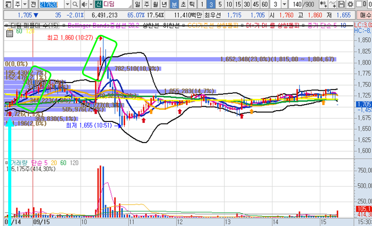 디딤 3분봉 입니다. 어제 공략종목으로 시초가에 큰 급등이후로 점점 하락한 종목인데 장 막판에 지지하는 구간에서 종가배팅후 시초가에 수익을 실현한 종목입니다. 시초가 이후 주가가 점점 하락했지만 갑작스러운 거래량이 터지면서 볼린저밴드 상단을 터치후 돌파하더니(2번째 네모박스) 10시 27분에 장중 최고점인 1860원을 찍었으며 6.9%까지 상승이 나왔었습니다.