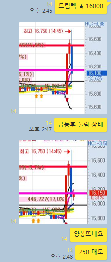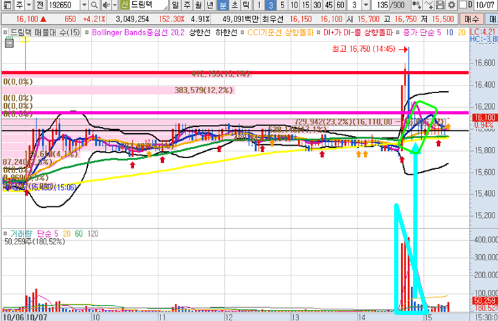 드림텍 3분봉 입니다. 오후 공략종목으로 급등상태에서 발견했지만 차분하게 눌림목 공략을 하기로 준비한 종목입니다. 10일선을 지지하는 것을 보며 반등시 빠르게 1.56%수익을 챙겼던 종목으로 여전히 추세가 살아있는 종목입니다.