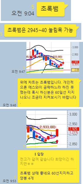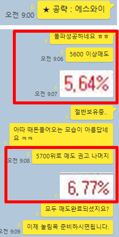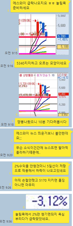 전일 미국장 급락으로 인해 국내지수 또한 급락으로 출발하였으며 그동안 보던 종목들도 힘을 못쓰는 상황이였습니다. 그러나 시초가 공략종목을 7%가까이 수익실현할 수 있었으며 다소 어려운 장이였지만 오후장에 추가적으로 공략한 SV인베스트먼트가 상한가에 진입하는 등 수익실현할 기회가 많이 있었습니다. 그럼 전체적인 매매타점에 대해 카카오톡 대화내용과 차트를 보면서 자세히 설명 드리겠습니다.