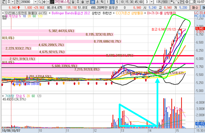 SV인베스트 3분봉 입니다. 1시경에 전일고점까지 상승이 나온상태에서 눌림이후에 다시 전일고점 재돌파가 나오며 제대로 급등이 나왔습니다. 전일고점 –> 피봇2차저항을 차례대로 뚫어주며 일시적으로 눌렸지만 10일선 지지를 받으며 그대로 상한가에 직행한 대박 종목입니다.