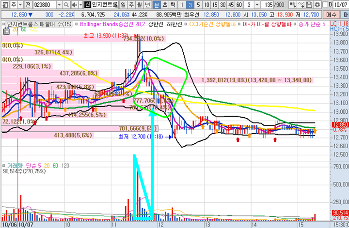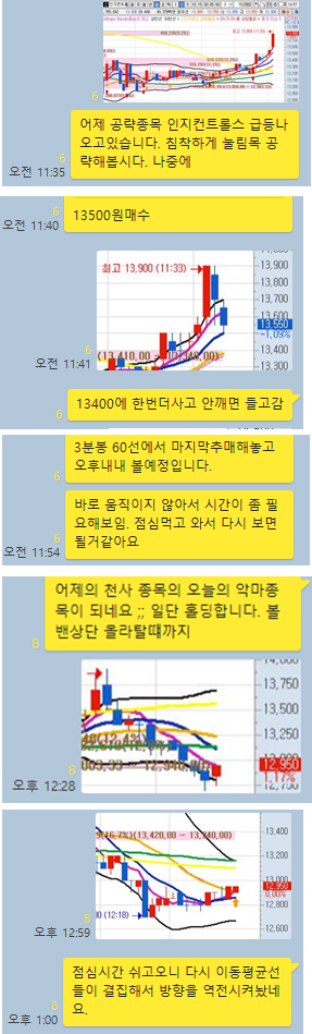 인지컨트롤스 3분봉 입니다. 어제의 공략종목으로 점심시간전에 급등이 나온 이후로 눌림목 공략을 시도한 종목인데, 10일서과 20일선 지지를 못할때 칼손절 처리를 했어야 하는데 오히려 볼밴최 하단이라 생각되는 부근마다 물량을 늘렸습니다.장 종료할 때까지 최저점 12700원은 계속 지켜줬으며 막판에는 12850원으로 마무리가 되었습니다. 일봉상 오늘 음봉으로 내일 양음양 패턴으로 간다면 큰 급등을 기대하고 있는 종목입니다.