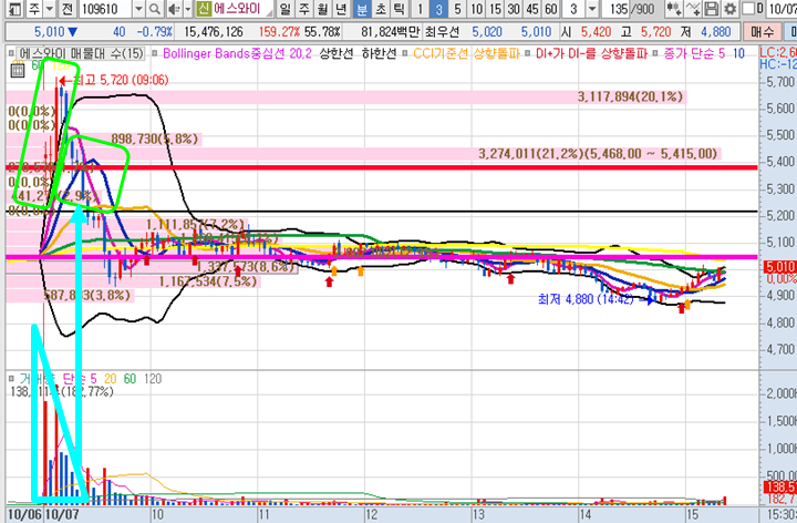 써니전자 3분봉 입니다. 시초가 돌파를 하며 우상향할 때 공유한 종목으로 왠만한 주요 지지선을 다 지켜내면서 장중 최대 18%이상 급등하며 5500원까지 상승하였습니다.