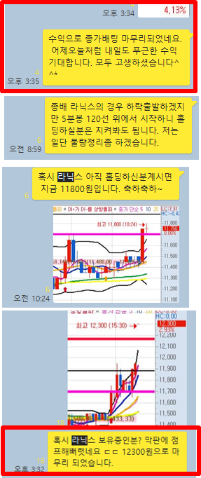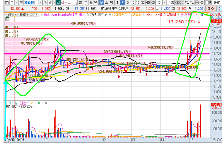 라닉스 3분봉 입니다. 어제 오후에 공략하고 4%이상의 수익이 나왔지만 바로 수익실현 하지않고 종가배팅으로 넘어가기로 한 종목입니다. 미국장 급락영향으로 하락출발했지만 120일선을 견고하게 지켜주면서 전일고점까지 급등이 나오며 오늘도 다시 상승할만한 분위기가 조성되었으며, 결국 장 종료시에 최고가인 12300원으로 점프하면서 마무리가 되었습니다.