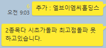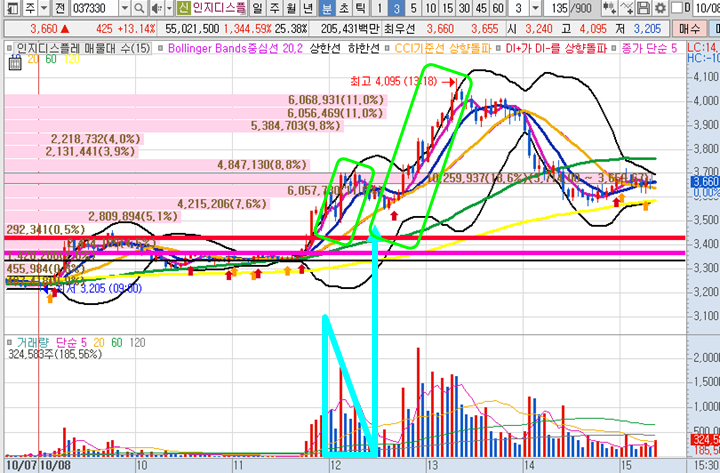 엘브이엠씨홀딩스 3분봉 입니다. 3분봉상 첫번째 분봉 최고점돌파한 종목으로 10일선 부근 눌림목 매수시 6분만에 3.48%수익이 나왔던 종목입니다.