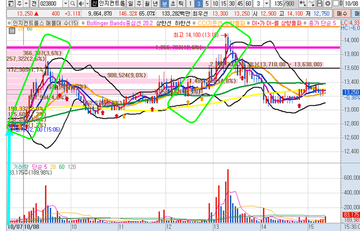 인지컨트롤스 3분봉 입니다. 어제 오후에 공략하고 물리면서 추가매수만 하면서 평균단가를 낮춰놓은 종목입니다. 미리 일봉을 보면서 양봉 나올자리라고 설명을 해주었고,(카카오톡 대화 첫번째 캡쳐내용)역시나 오늘 장중 10%가까운 급등이 나오면서 최고점에서 물려있었더라도 충분히 수익으로 나올 수 있었던 효자 종목이였습니다.