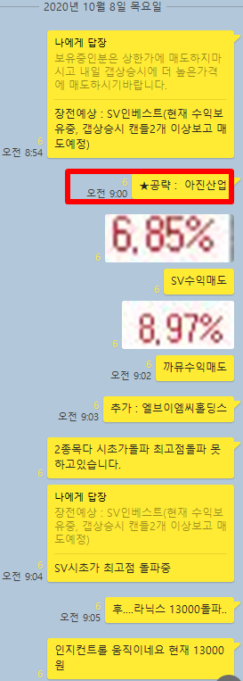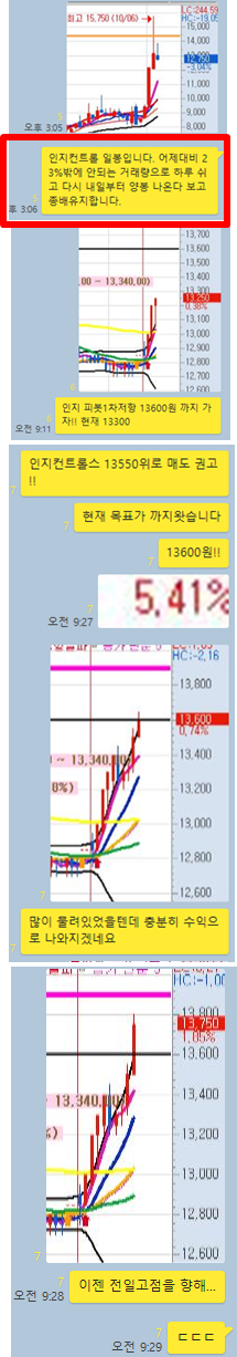 참 기분좋은 하루였습니다. 종가배팅 종목들이 급등 하면서 개장과 동시에 수익을 챙길 수 있었으며 어제 물려있었던 인지컨트롤스를 목표가에서 매도하며 크게 수익을 챙길 수 있었습니다. 오후에는 인지디스플레 까지 10%수익을 실현하니 인지 형제에게 감사하지 아니할 수 없습니다.^^ 그럼 전체적인 매매타점에 대해 카카오톡 대화내용과 차트를 보면서 자세히 설명 드리겠습니다.