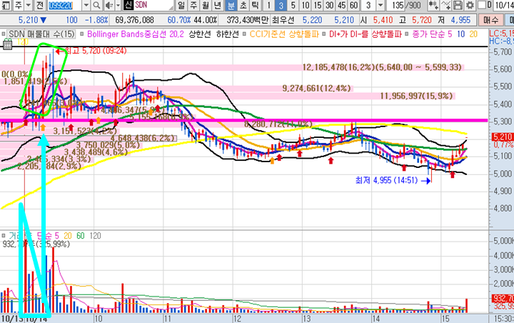 SDN 3분봉 입니다. 시초가 공략종목으로, 갭상승 출발이후 일시적으로 눌림이 있었습니다. 10일과 20일선에 물량을 많이 담으면서 피봇1차저항 목표가를 기다리며 최종적으로는 4.63% 수익을 실현한 종목입니다. 처음부터 정확한 눌림목 매수타점에서만 진입하고 피봇1차저항 부근에서 매도했다면 15분안에 8.5%수익이 가능한 구간이있었습니다.