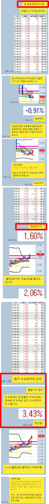 한송네오텍 3분봉 입니다. 최근 상승세가 유지되며 시장에 관심을 받고 있는 종목으로 오후장에 피봇2차저항까지 급등이 나오다가 하락하는 모습에서 60일선 지지시에 2190원에 매수가격을 공유하였고, 잠시 자리를 비운사이에 120일선까지 하락이 나와서 일단 1%가량 절반손절처리를 하였습니다. 120일선을 지지하니 1시간 내내 천천히 상승하며 결국 최종적으로는 3.43%수익을 실현할 수 있었던 종목입니다.