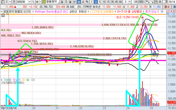 광동제약 3분봉 입니다. 3분봉상 첫번째 분봉 최고점돌파한 종목으로 주요 지지구간 마다 상승이 나와주면서 오전에도 수익가능한 구간이 있었고, 오후에 서서히 거래량이 터지면서 진일고점 → 피봇1차저항 → 피봇2차저항을 차례대로 뚫어주면서 큰 시세가 나올때에 일시적으로 10일선 눌림목 매수타점을 잡아서 5.18% 수익을 실현한 종목입니다. 장중 최고 18%이상 상승이 나왔다가 2차 VI가격까지는 가지 못하고 막판에 급락이 나오면서 마감되었습니다.