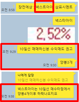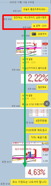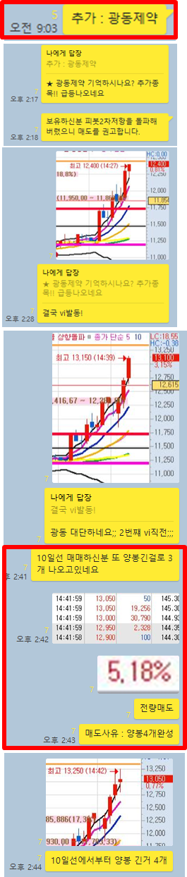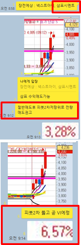 그리고 추가적인 공략종목 1개를 공유하였습니다. 추가 종목의 경우 오전에는 잠잠했지만 오후에 폭등이 나오면서 매매타점에서 크게 수익을 실현할 수 있었으며, 시초가 공략종목은 역시나 모두 수익을 실현할 수 있었습니다. 특이사항으로 오후에 공략한 종목의 경우 3일 연속으로 절반 손절이후에 홀딩했다가 크게 수익을 실현할 수 있었습니다. 그럼 전체적인 매매타점에 대해 카카오톡 대화내용과 차트를 보면서 자세히 설명 드리겠습니다.