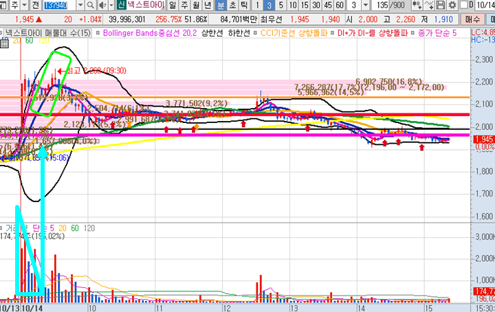 넥스트아이 3분봉 입니다. 3분봉상 첫번째 분봉 최고점돌파한 종목으로 잠시 눌리긴했지만 다시 10일선을 타고 양봉4개가 나오면서 어쨌든 초반 첫번쨰 분봉 고점에서 매수했다 하더라도 수익이 가능했던 종목이였습니다.