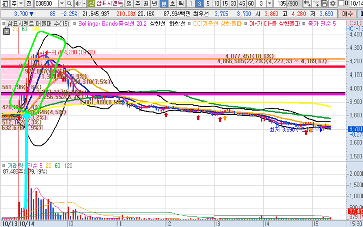 삼표시멘트 3분봉 입니다. 장전예상 종목으로 선정하여 공유한 종목으로 예상대로 시초가 갭상승이 나왔으며 2번째 캔들을 돌파 관점으로 접근하여 최종적으로 6.57% 수익을 실현한 종목입니다. 9시 30분에는 장중 최고점인 4280원까지 13%이상 상승하였으나 거기가 최고점으로 그이후에는 계속 하락이 나왔습니다.