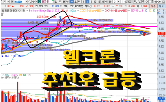 위에 보이는 차트 그림은 황금색선(20일선) 까지만 하락하고 지속적으로 상승하여 급기야 전일고점 가격인 8600부근을 뚫어주면서 슈팅이 한번 나왔습니다.