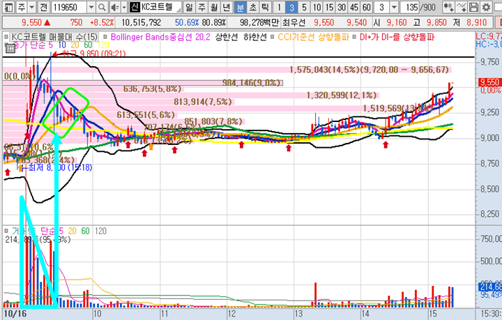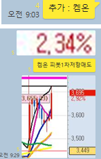 KC코트렐 3분봉 입니다. 시초가 공략종목으로, 갭상승 출발이후 첫번째 캔들 최고점 돌파관점으로 공유하였으며 당시 피봇1차저항까지 바로 상승하며 빠른진입시 수익구간도 신속히 가능했던 종목입니다. 피봇1차저항이 저항대로 작용하며 갑작스러운 급락이 나올때 여유있게 9120원 부근에 매수하면서 양봉4개정도 보고 매도한다는 생각이 이번에도 맞아떨어지면서 12분안에 안전하게 수익을 챙길 수 있었습니다. 60일선 지지가 나오면서 결국 오후장에 9550원까지 급등하면서 마무리가 된 종목입니다.