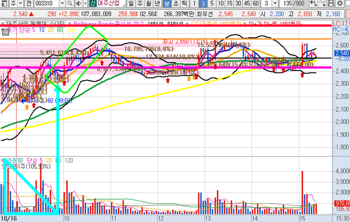 대주산업 3분봉 입니다. 전 거래일 오후장에서 상한가까지 급등한 대단한 종목으로 오늘 출발은 미비했지만 서서히 올라오며 전일고점을 돌파하고 있었습니다. 그러나 피봇1차저항을 맞고 하락하는 와중에 지지하는 구간을 찾아 2330원 매수타점을 미리 제시하고 난뒤에 최종적으로는 10%이상의 수익을 실현했던 종목입니다. 이 종목은 정석대로 올라야할 자리에서 크게 반등이 나와주고 있는 매력적인 종목입니다.