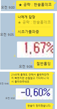 그리고 추가적인 공략종목 2개를 공유하였습니다. 오늘은 ★장전예상 종목인 KEC가 장중에 상한가에 진입하였습니다. 나머지 공유한 종목에 대해서는 어디가 적합한 매매타점이였는지 같이 알아봅시다. 그럼 전체적인 매매타점에 대해 카카오톡 대화내용과 차트를 보면서 자세히 설명 드리겠습니다.