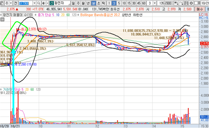 파워로직스 3분봉 입니다. 9시3분경 추가적으로 공유한 종목으로 갭상승후 볼밴상단까지 하락하였지만 그곳을 지지하며 양봉 3개가 나오며 수익구간을 충분히 줬던 종목입니다.