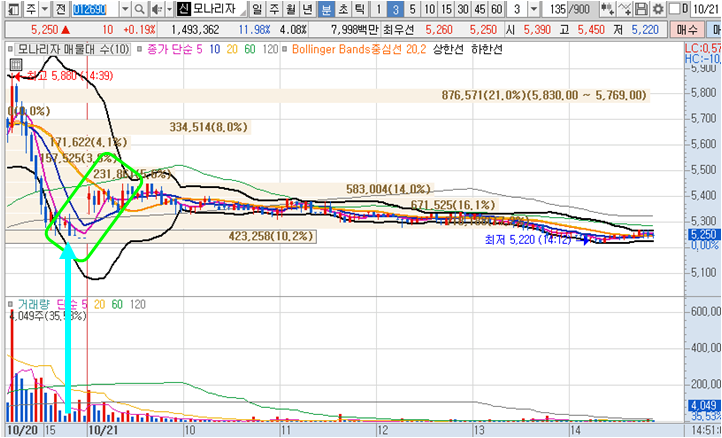 모나리자 3분봉 입니다. 어제 오후장에 급등후 급락상황에서 120일선 지지여부를 확인하고 최적의 매수타점을 공유하였습니다. 거의 최저점에서 공유하고 다음날 3% 갭상승시 매도하면서 충분한 수익을 챙길 수 있었습니다.