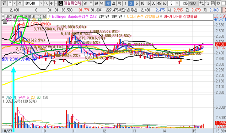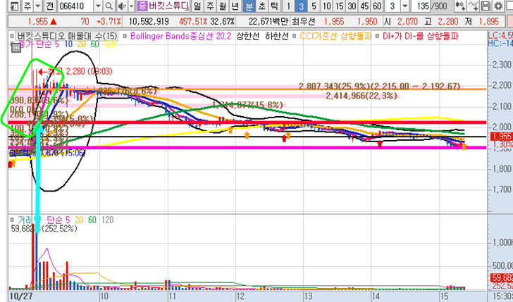 버킷스튜디오 3분봉 입니다. 시초가 공략종목으로 갭상승 출발이후 2번쨰 캔들이 볼밴상단 닿을때 매수했다면 3분안에 무려 10%가까운 수익구간이 나왔습니다만 그 이후로 지속적으로 하락하면서 장마감시에는 거의 최저점으로 마무리되었습니다. 이렇듯 시초가 공략종목은 가능하면 신속정확하게 매매하는 것이 중요하고 이유없이 종목을 계속 보유할 필요가 없으며 원하는 만큼의 수익이 나오면 잽싸게 정리할 줄 알아야합니다.
