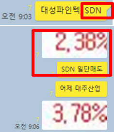 대성파인텍 3분봉 입니다. 2번째 캔들인 9시3분부터 공유한 종목으로 정확한 매수타점을 찍어주며 최단기간 2번이나 수익을 실현할 수 있었습니다. 연두색 네모박스안에서만 각각 5%, 3% 수익이 나왔습니다.