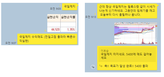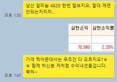 종배하고 시초가에 물량을 전량 매도하여 수익을 챙겼습니다. (상기 카톡대화내용 수익참고)