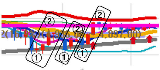 지지하는 걸 확인하고 나서야 120일선인 ① 에서 매수하고 전일고점선인 ②에서 매도 하는 방법으로 2번~3번 정도 단타가 가능한 구간이였습니다.