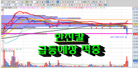 한진칼 입니다. 시초가도 좋았었고, 계속 양호한 흐름을 보였지만 장 막판에 급락한 차트 입니다.