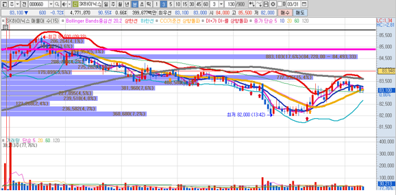 상기 차트는 5분봉 차트 인데, 굵은 회색선 보이시지요? 그게 5분봉에 생명선이라고 하는
