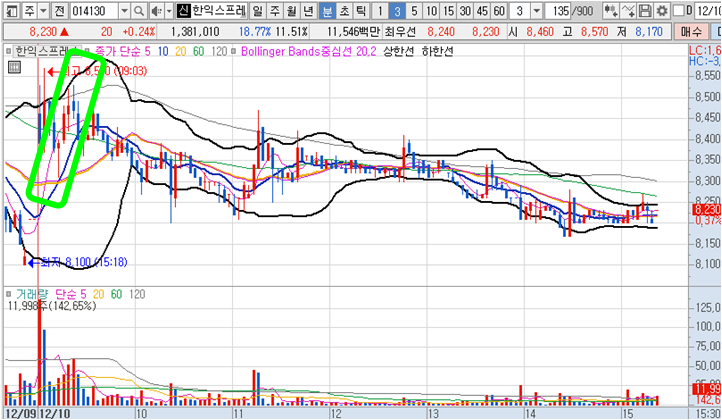 휘닉스소재 3분봉 입니다. 오늘의 시초가 공략종목으로 선정하였으며, 10일선을 강력하게 지지하기위해 큰돈이 들어오는 모습을 포착하고 언급한 이후 피봇1차저항과 피봇2차 저항을 차례대로 돌파하고 Vi까지 발동되며 볼밴상단을 보며 최고점이라 예측한 9시37분경 모든 물량을 정리하고 최종적으로는 15.42%라는 놀라운 수익률을 달성하였습니다. 제가 예측한 최고점이후 놀랍게도 주가는 지속적으로 하락하여 결국 -2%이하로 떨어지며 마감되었습니다.