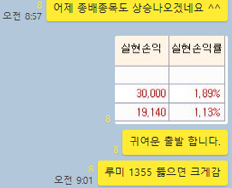 늘 그래왔듯이, 종가배팅한 종목 수익을 실현하였고, 시초가도 수익 실현하였습니다.