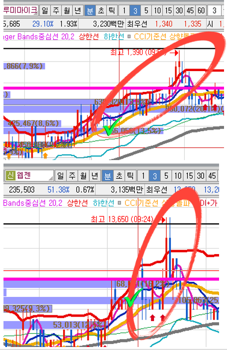 어제 종배종목 2개는 차트도 비슷하고 상승구간도 비슷하였습니다.