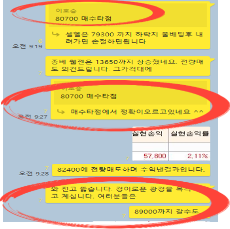 80700매수타점에서 정확히 오르고 있다고 이야기하는 장면입니다.